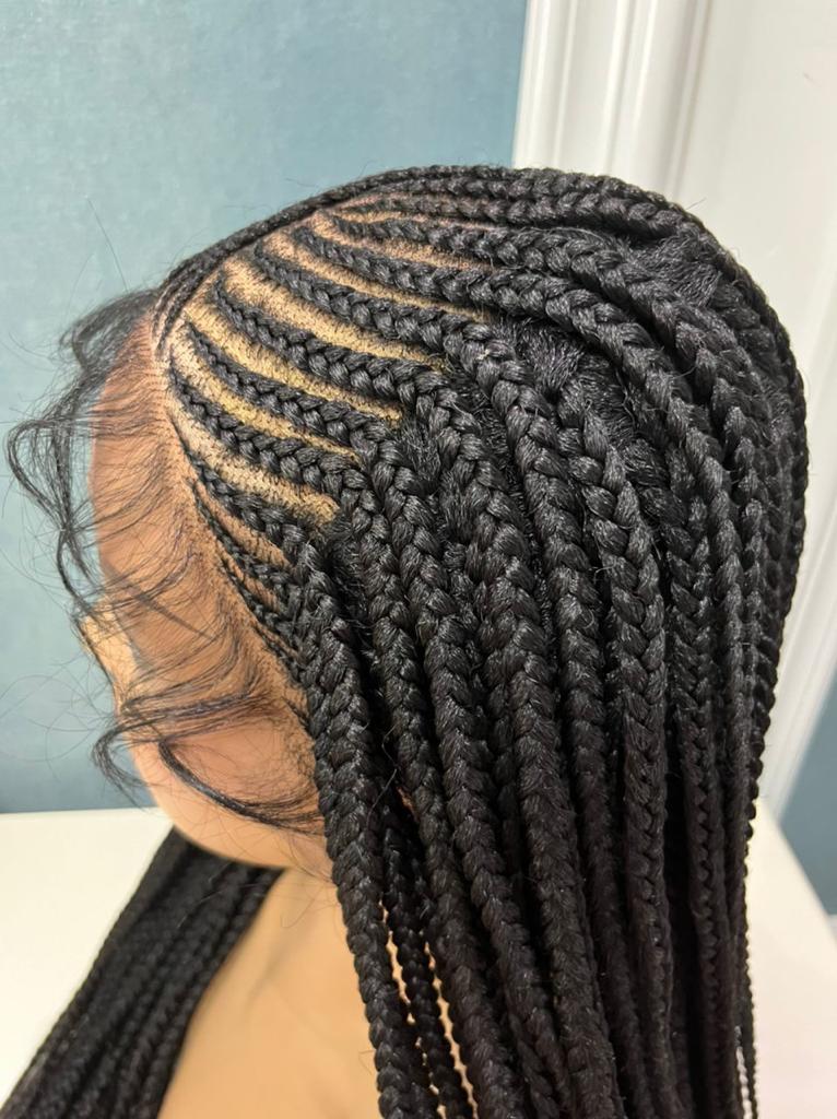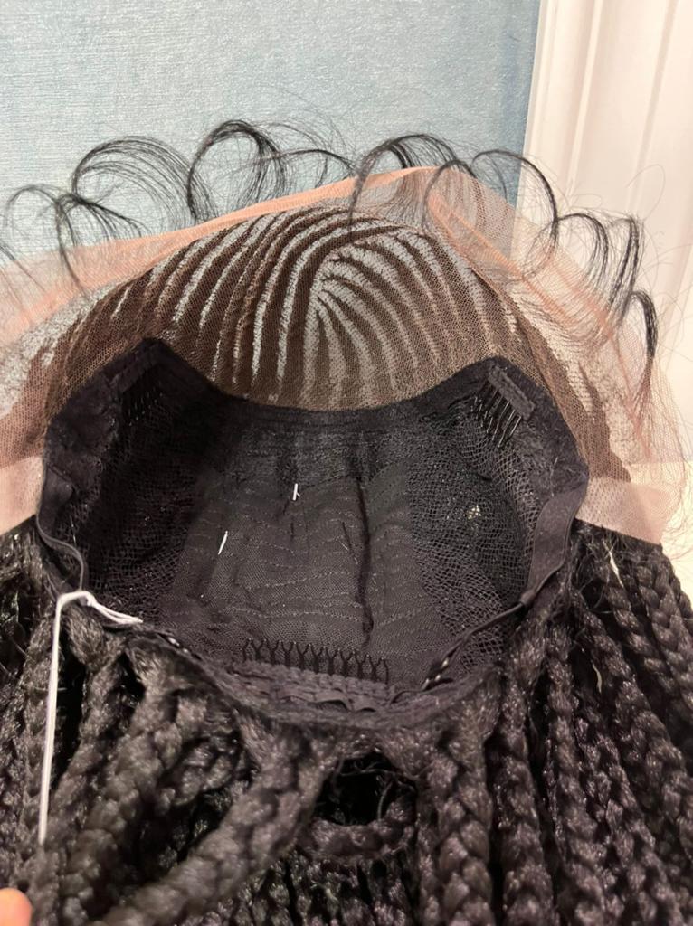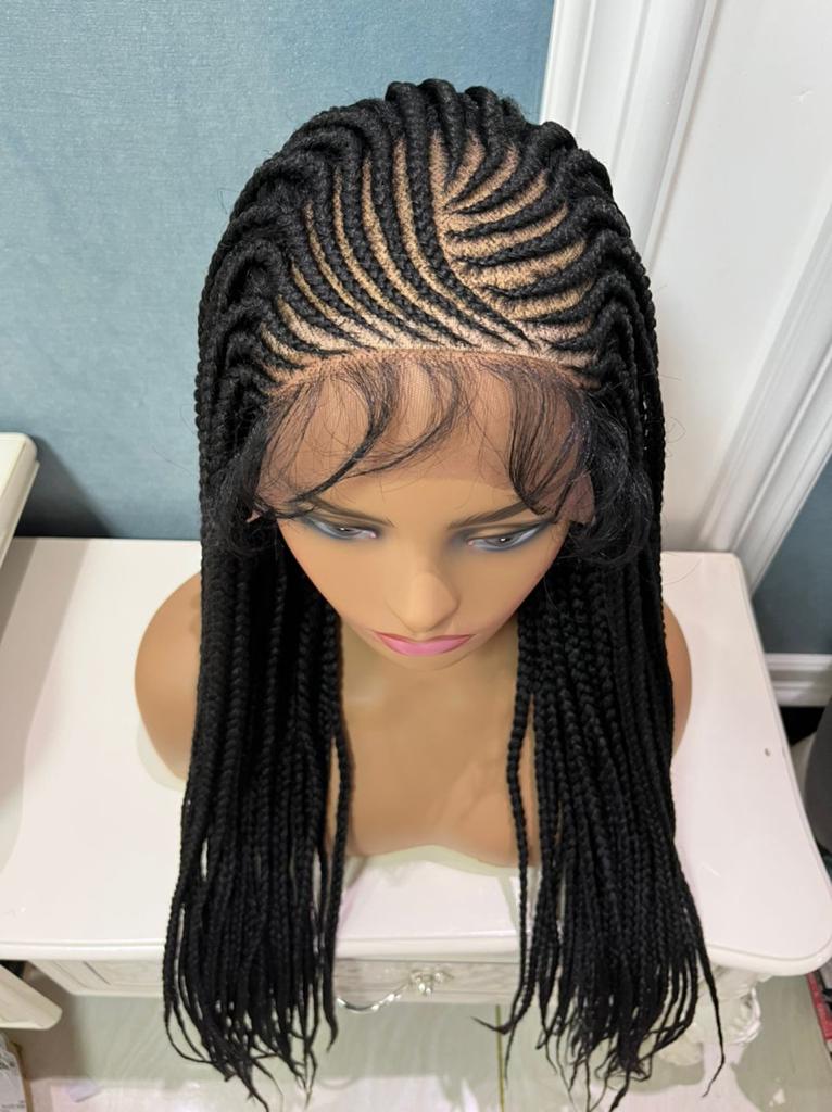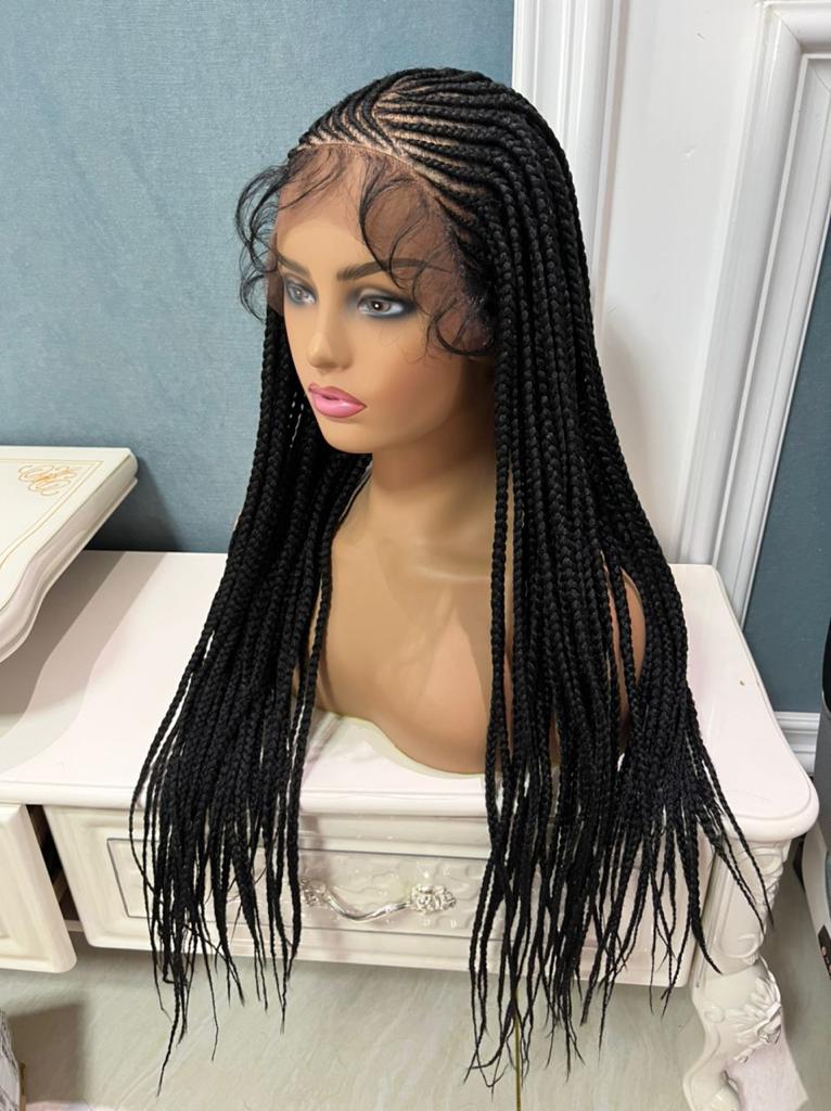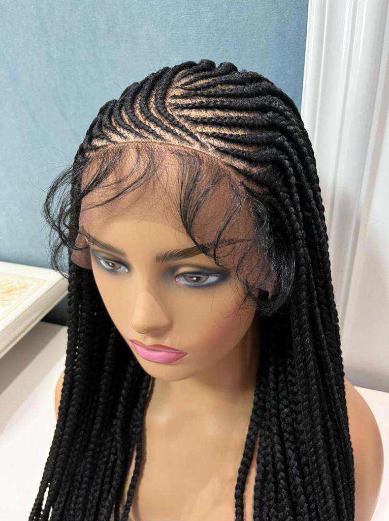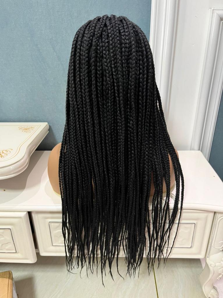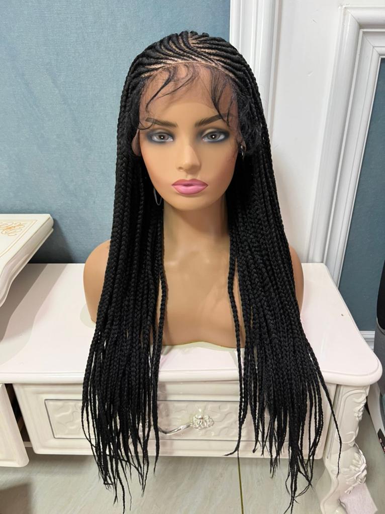 This braided full lace wig is 36" long. Its made with synthetic fiber hair that is light weight.
