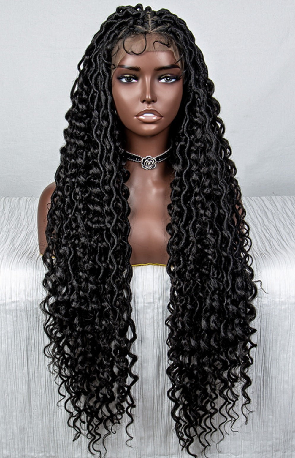 This braided full lace wig is 36" long. Its made with synthetic fiber hair that is light weight.